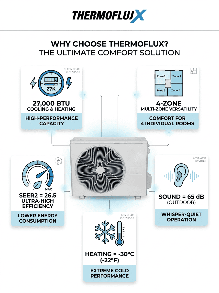 THERMOFLUX 27000 BTU Multi-Zone Heat Pump Up to 26.5 SEER2 | 65 dB | -22°F (-30°C) | Eco-friendly R454B